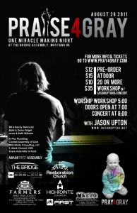 Praise4Gray with Jason Upton is only ONE WEEK AWAY!!!! All the final preparations are being made and the details are falling into place!!!! We are expecting a great night of corporate worship with all of those praying and believing for Gray and his family!!!! If you haven’t yet purchased your tickets for the evening then DO SO NOW!!!! In order for your tickets to be mailed to you, you will need to purchase them via this website BEFORE Monday, August 22, 2011. You can still place an order via this website for tickets after Monday but if you do so they will be held at the venue door. We will also have tickets for sale for $15 each at the door of The Bridge Assembly of God the evening of the concert. If you would like to attend the worship workshop with Jason Upton at 5:00PM on Friday, August 26, 2011 before Praise4Gray we will also have tickets for sale for the workshop at the door. Tickets for the workshop are $35 each and include admission to the evenings concert. TO OUR CHURCH FAMILY AT “THE BRIDGE”, we will be selling tickets to the concert, workshop tickets and Gray Gear in the lobby of our church THIS SUNDAY, August 20, 2011!!!! We will be open during all three morning services and the evening service!!!! Please stop by and get your ticket!!!! We will be ACCEPTING CREDIT CARDS both on Sunday morning in the church lobby AND at the doors of the Praise4Gray event!!!! Invite a friend and come ready for an amazing night of worship!!!! WE CAN’T WAIT TO SEE YOU THERE!!!!
